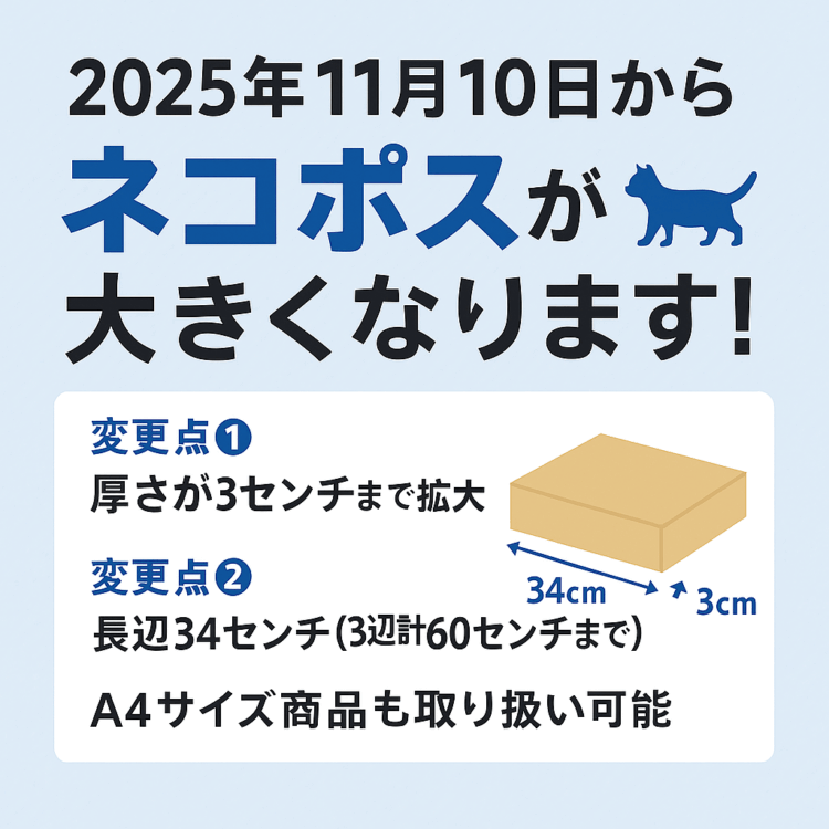 最大の大きさは縦・横・厚みの計が90cm内、長辺が60cm内、重さ4㎏まで。